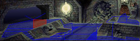 Cada habitación tiene su propia matriz de colisiones, la cual es generada a partir de una imagen BMP donde el color negro significa “muro” y cualquier otro color indica “camino”. Más tarde el color de la parte caminable se utilizó para definir que cámara es usada en cada momento, pero eso es otro tema.