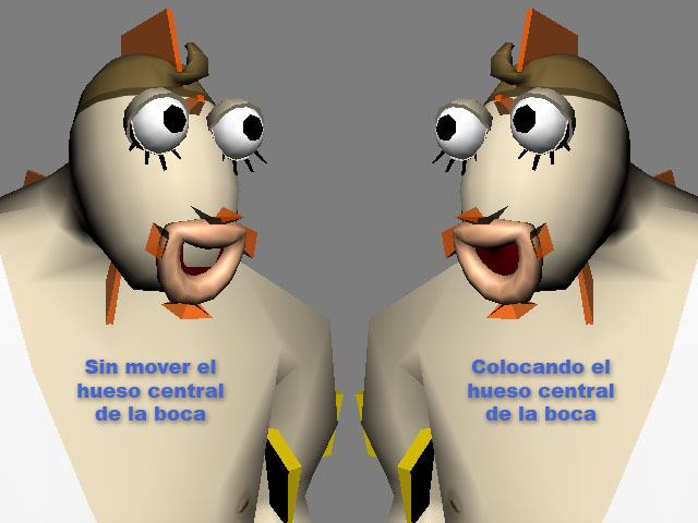 Para el interior de la boca se optó por cerrar el interior del toroide con un color plano. Debía estar también modelado, para que se adaptara a las deformaciones de los labios y cubriera todo el «hueco» fuera lo grande que fuera. La práctica obligó a aumentar el número de polígonos de este interior de la boca y colocarle un hueso propio para que no atravesara la cabeza del personaje. En la imagen se puede ver como se corrige este problema moviendo el hueso hacia adelante.