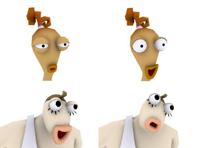 Como puede verse en las imágenes de arriba, los ojos no pueden ser mas simples… y, al igual que con la boca, la razón estaba en simplificar un aspecto general de los personajes para poder ahorrar tiempo a la hora de modelar. Preparar una cavidad ocular en las caras o hacer unos párpados que quedaran bien con esas cavidades requería de un modelado especial para cada personaje.